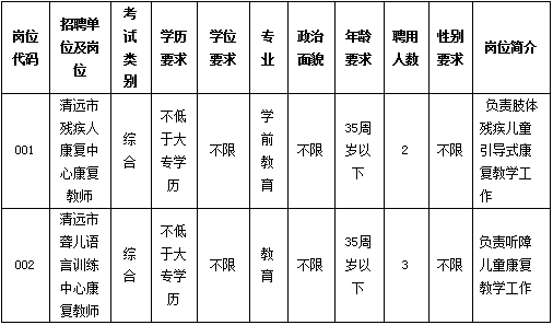 清遠市殘疾人康復中心、清遠市聾兒語言訓練中心,是市殘聯直屬公益一類事業單位,是專門為0-6歲殘障兒童康復的機構。根據工作需要招聘康復教師5名(屬非編制人員,不列入用人單位編制序列,不擔任行政職務),現將有關事項公告如下: