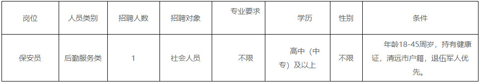 清遠(yuǎn)市清城區(qū)機(jī)關(guān)事務(wù)管理局因工作需要,根據(jù)《關(guān)于印發(fā)<清遠(yuǎn)市清城區(qū)機(jī)關(guān)事業(yè)單位專(zhuān)項(xiàng)工作聘員、合同制聘員以及后勤服務(wù)類(lèi)人員管理辦法>的通知》(城區(qū)人社[2022]20號(hào))文件精神,面向社會(huì)公開(kāi)招聘后勤服務(wù)類(lèi)人員1名,現(xiàn)將有關(guān)事宜公告如下: