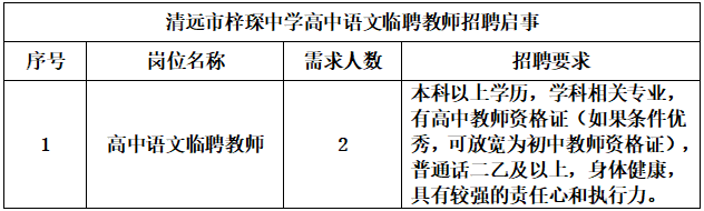 清遠市梓琛中學創(chuàng)辦于1987年,學校原名廣智中學,2002年為紀念香港同胞梁梓琛先生易名為梓琛中學,2013年學校從鎮(zhèn)屬高中升格為清遠市教育局直屬高中。學校是清遠市華僑中學協(xié)同發(fā)展學校、清遠市禁毒教育示范校、清遠市積極教育示范校、清遠市學校文化建設示范校、清遠市生命健康安全學校、廣東省綠色學校、廣東省依法治校達標校。學校以廣智教育立校辦學,努力打造自勝致遠精神,培育學生“廣天下之智”。為適應學校教育教學的實際需要,現(xiàn)需招聘高中語文臨聘教師兩名。
